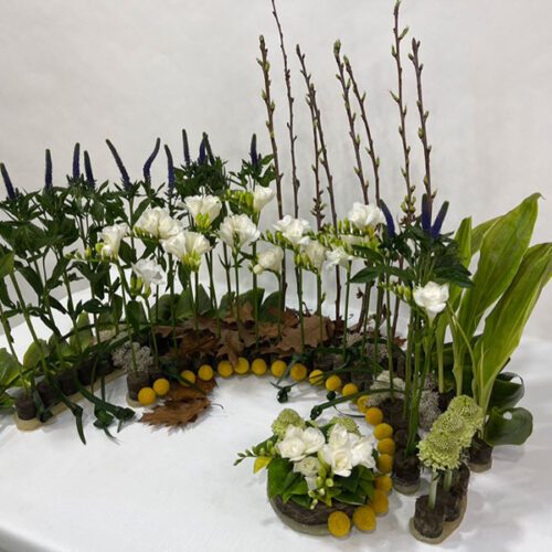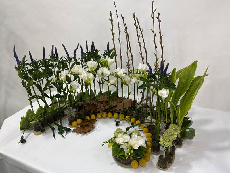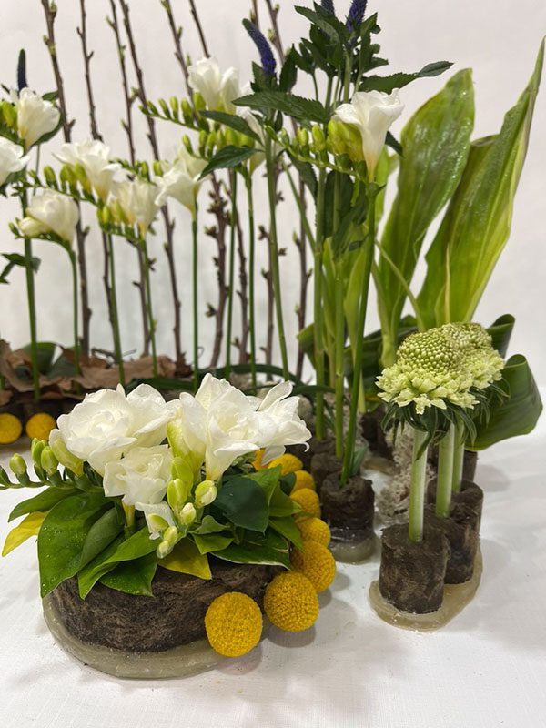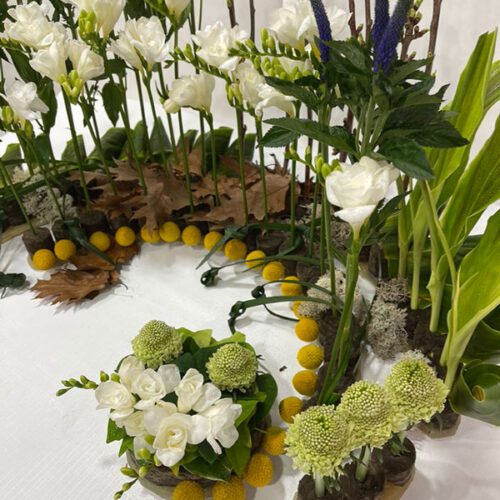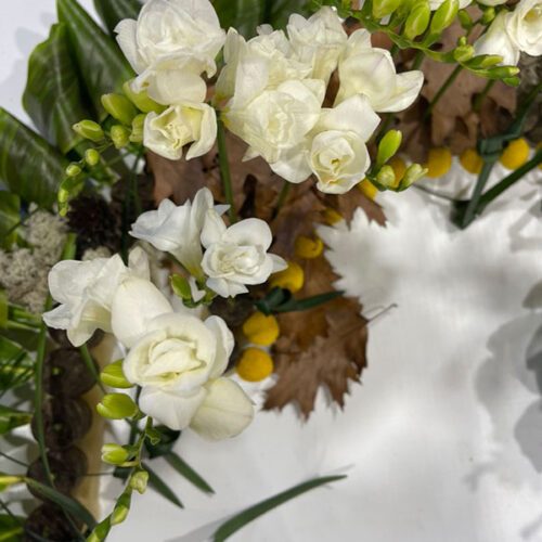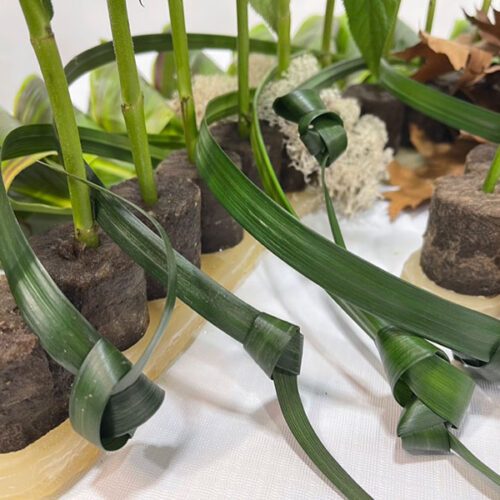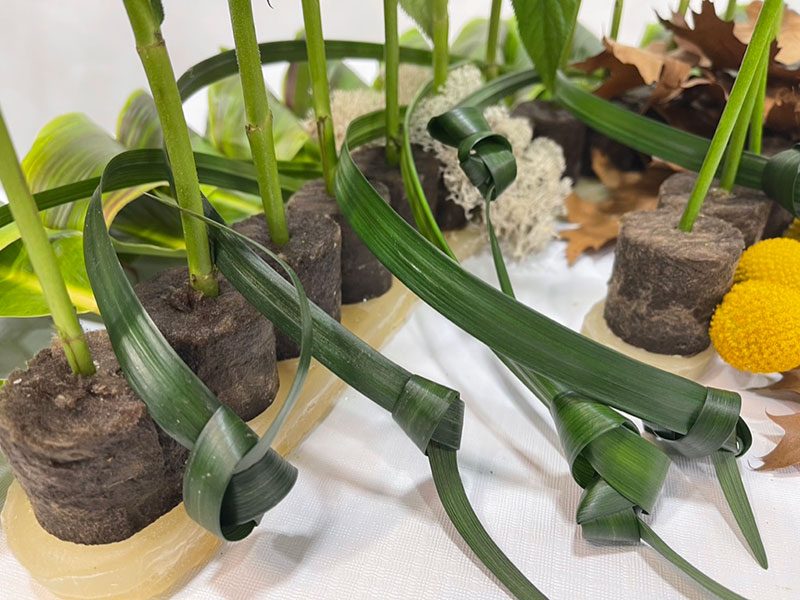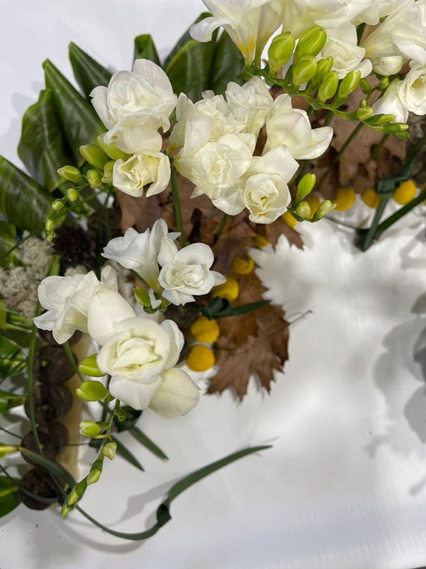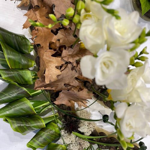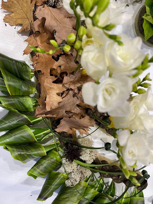 Composter: Tous les éléments naturels soient fleurs et feuillage ainsi que la mousse florale bio.