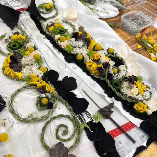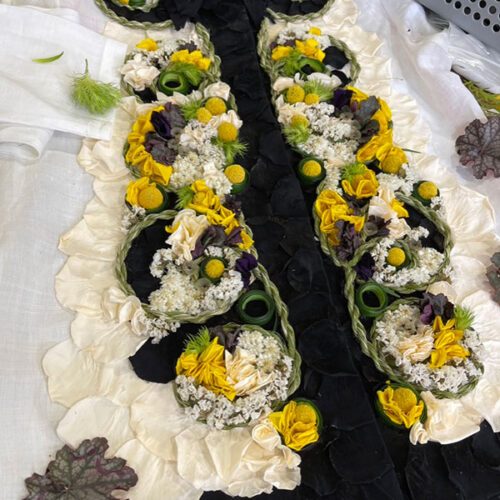 La base fleuri est en partie piquée dans de la mousse florale ou placée dans des récipients d’eau.