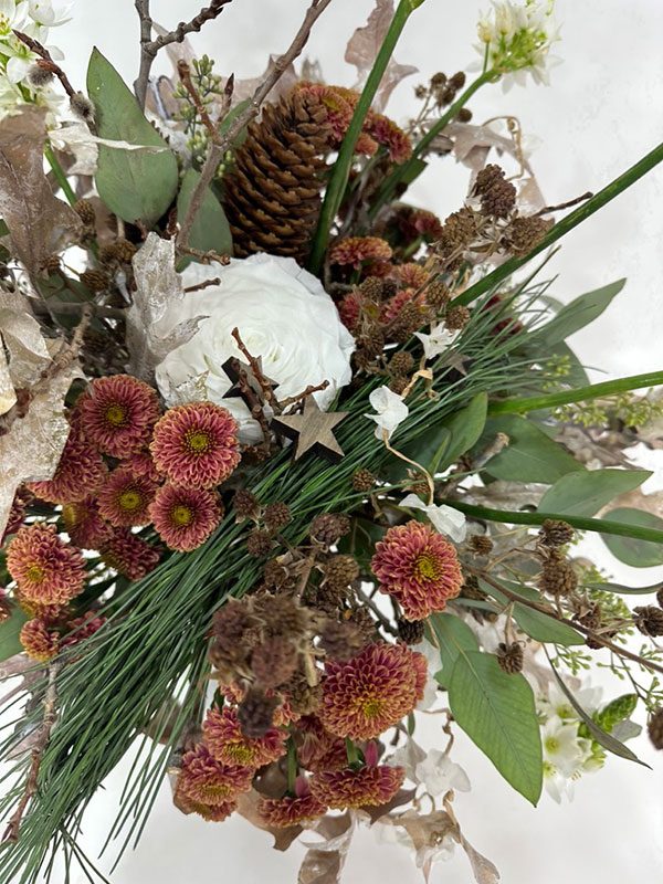 Les différentes matières (naturelles, séchées, etc.) utilisées dans la création de ce bouquet apportent un jeu de textures qui confère du raffinement à l’ensemble.