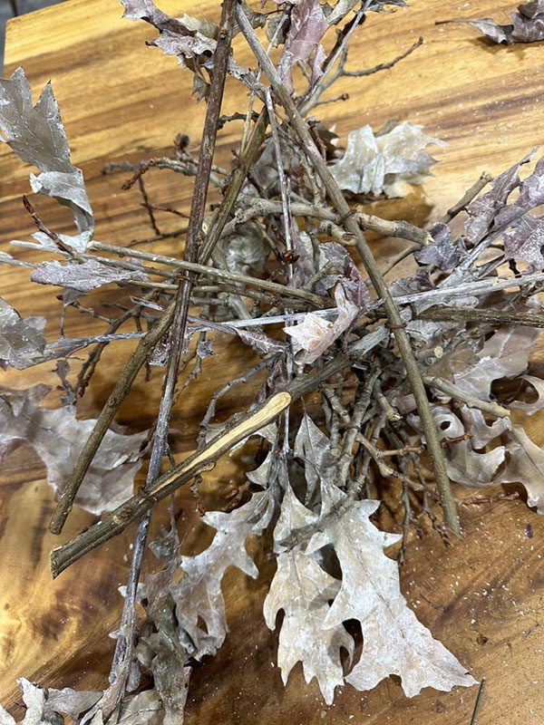- Réduire : On utilise des branches ramassées ou des tiges restantes qui permettent de réduire le feuillage habituellement utilisé pour créer la forme et le volume du bouquet.