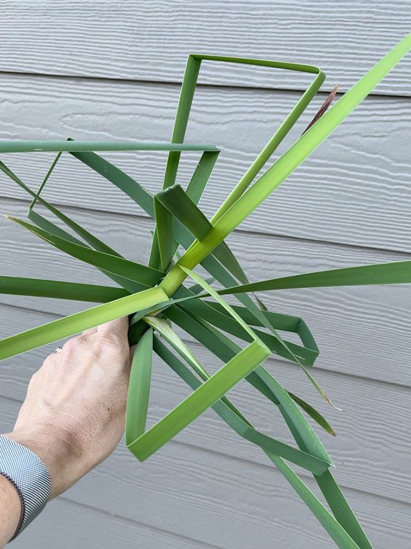 À partir d’un seul plant (ou plusieurs selon le format de base désiré) et en utilisant la longueur des feuilles on arrive à créer en quelques minutes une structure de base à fleurir.