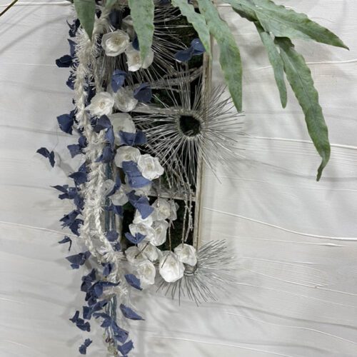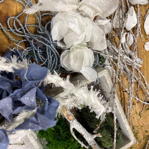 Réutiliser: Les pétales de roses préservées blanches. Du fil décoratif coupé en trop. Des bouts de ruban tressé en cordon.