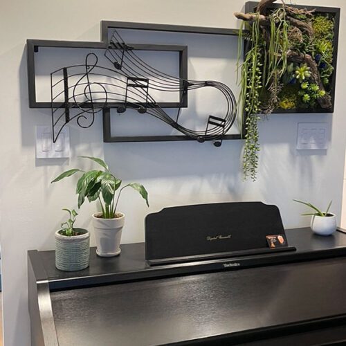 Recycler : Le cadre au-dessus du piano a été confectionner avec des retailles de bois exotiques.